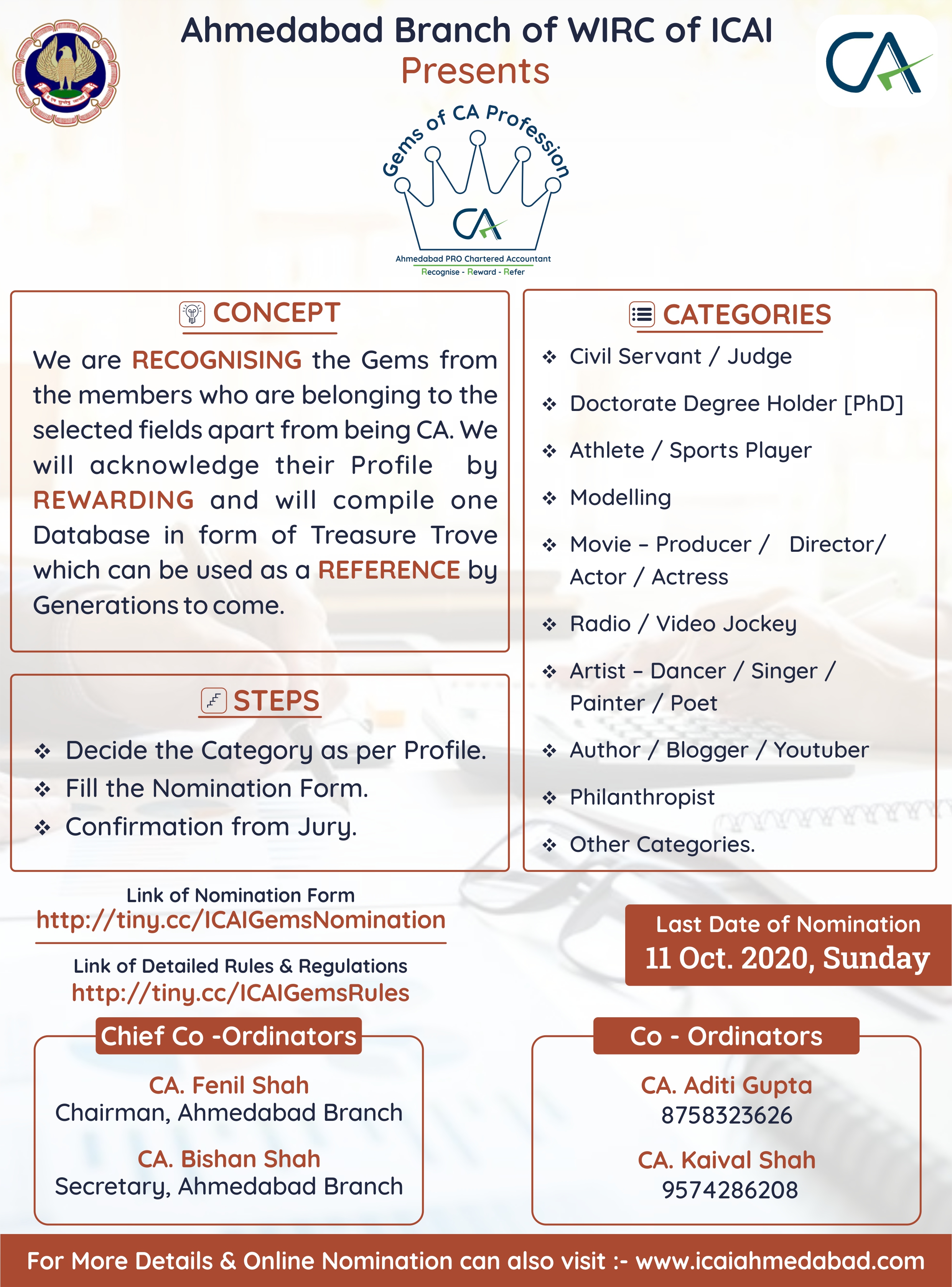 1] RECOGNIZE: We aim to recognize the hidden Gems having the profile and talent apart from being a Chartered Accountant. We have designated few categories for Nomination. If your profile doesn’t fit that pre-defined category, but if you deem fit that you are PRO CA then nominate in Others Category.