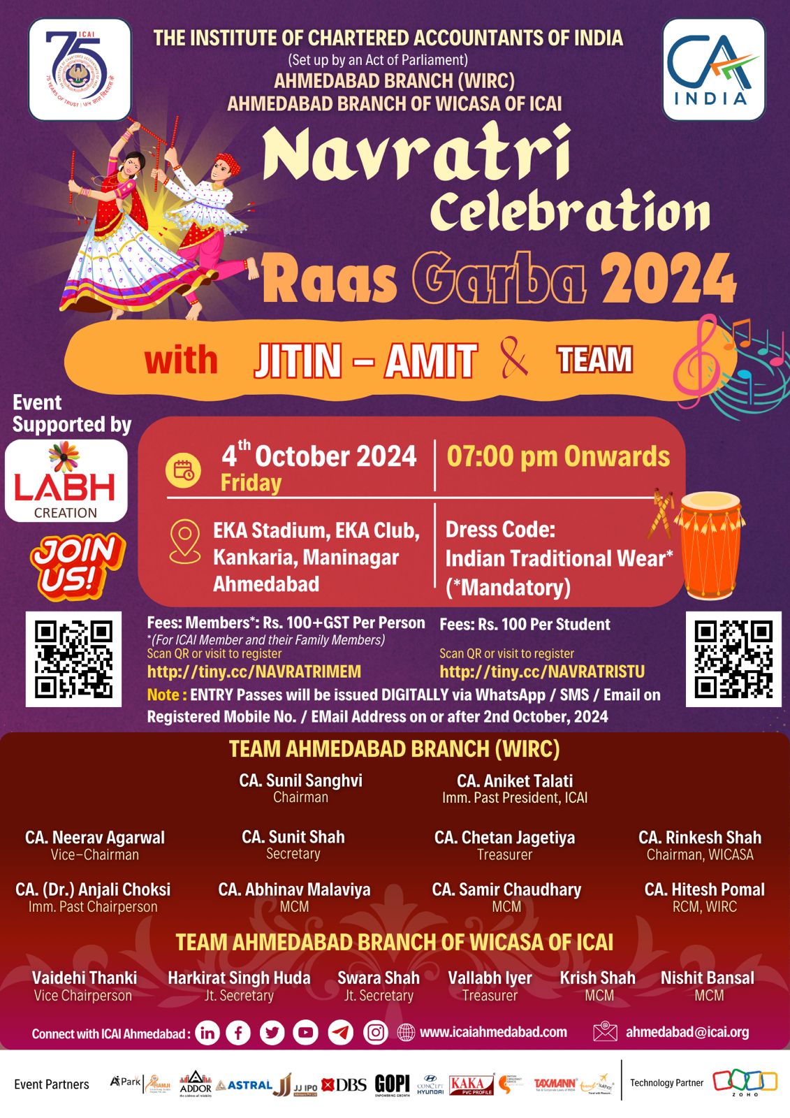 It will be a REFRESHING evening with Chartered Accountants along with their Family, ICAI Students and a tribute to our Goddess Ambe Maa on these auspicious days of Navratri, a celebration with the BEST SINGERS JITIN - AMIT on Friday, 04th of October, 2024 @ EKA Stadium, EKA Club, Kankaria, Ahmedabad