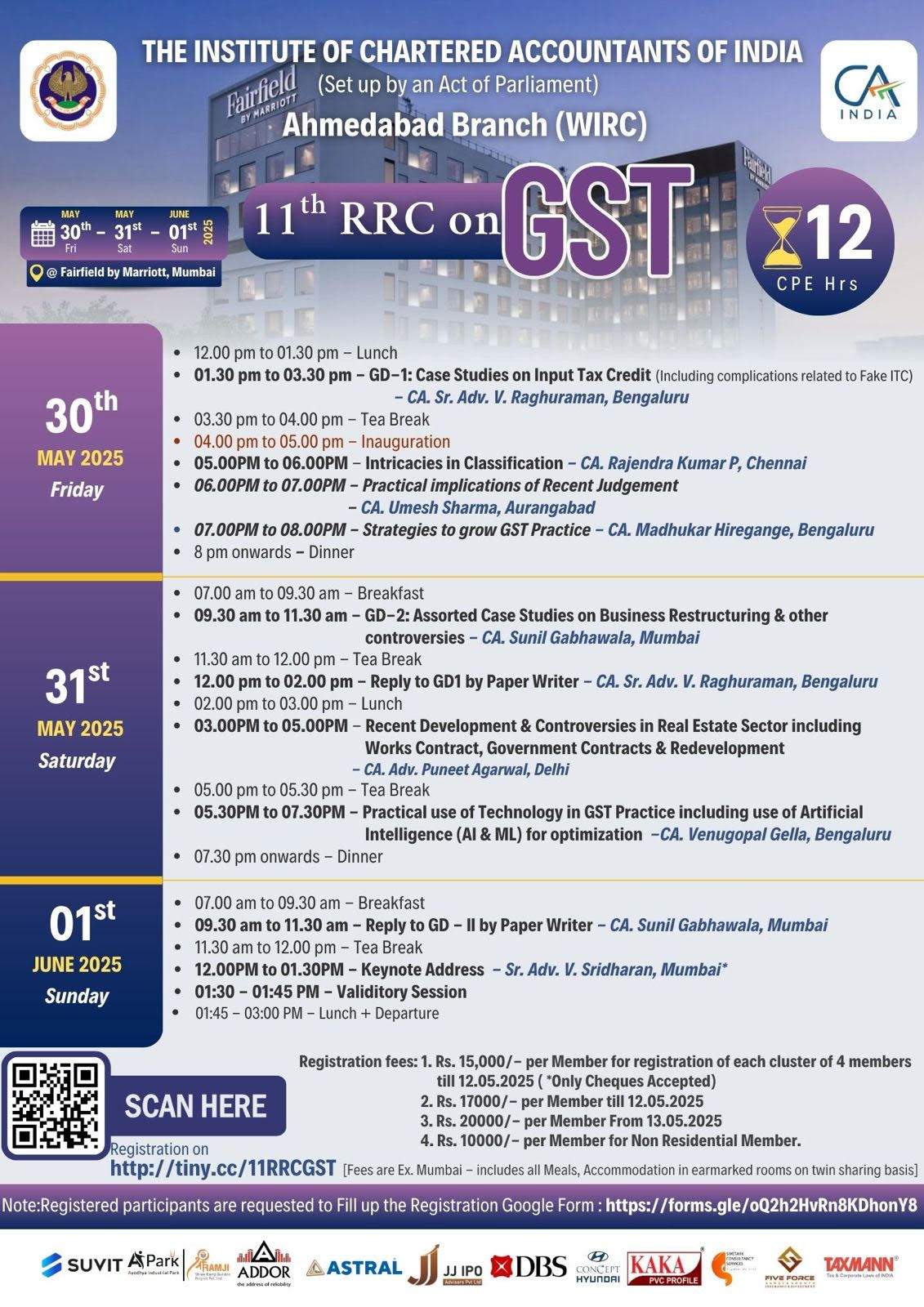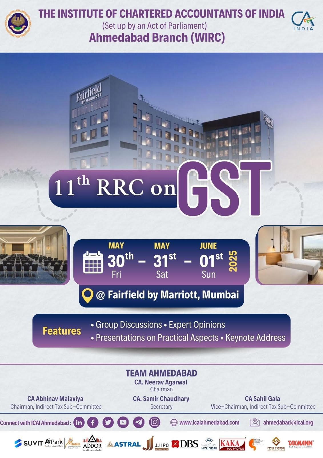 We are thrilled to announce the 11th Residential Refresher Course (RRC) on GST, scheduled from 30th May to 1st June 2025 at the luxurious Fairfield by Marriott, Mumbai.